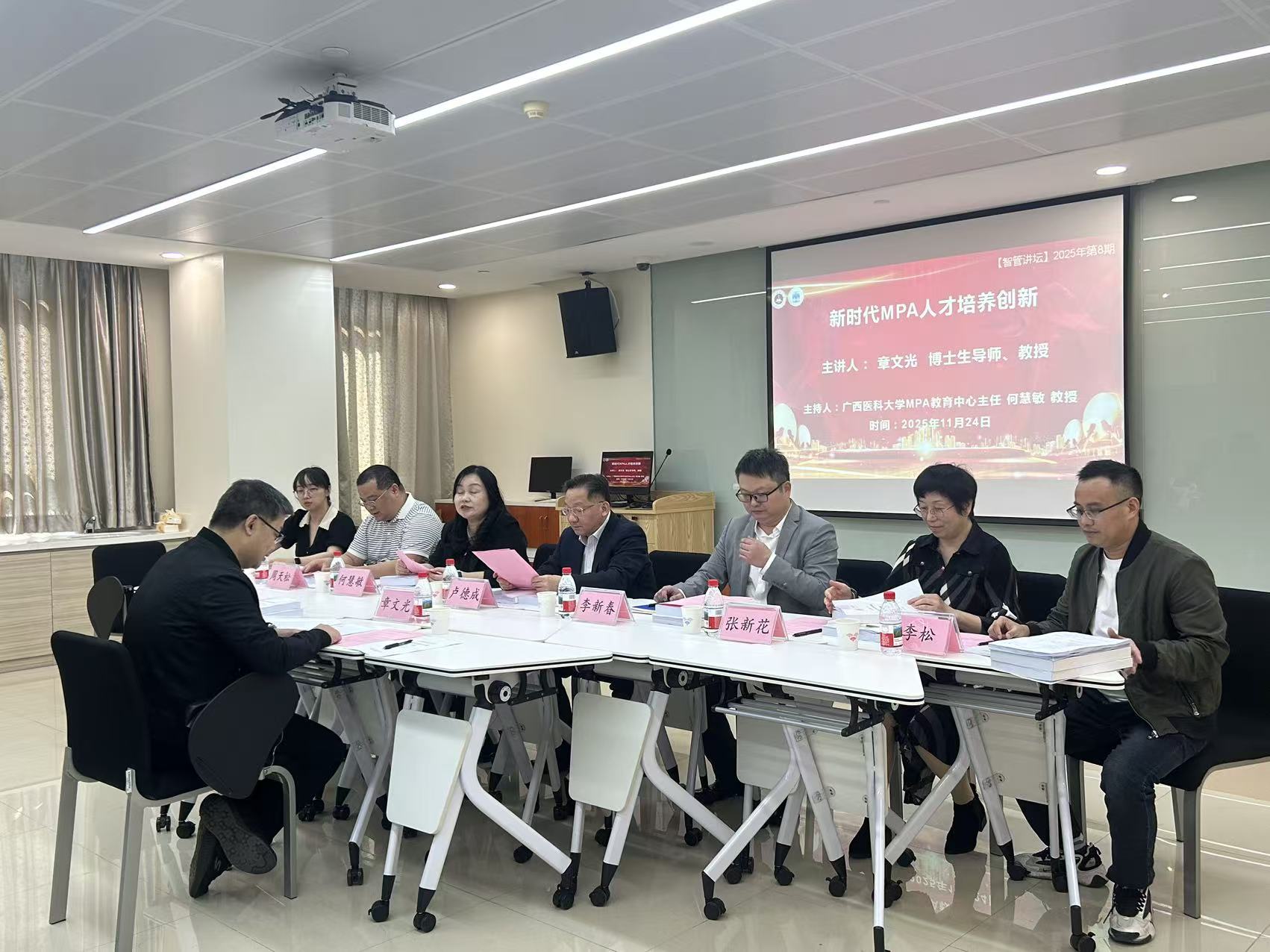 2025年11月24日上午,北京师范大学章文光教授应邀莅临广西医科大学,围绕公共管理人才培养和学位点建设开展了专题讲座。我校卢德成副校长、研究生院院长李新春教授、MPA教育中心主任何慧敏教授、MPA教育中心副主任张新花教授、MPA教育中心工作人员及教师参加了本次活动。