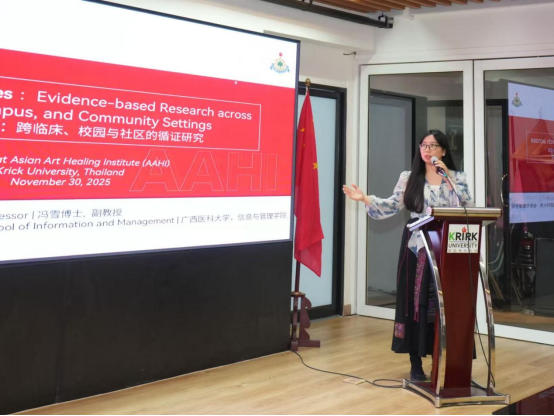 在学术论坛中,我院冯雪副教授受邀进行题为《中泰学术合作视野下艺术治疗与艺术疗愈的实践:临床、校园与社区的多元应用研究》的主旨演讲。她系统梳理了艺术疗愈的医学基础与应用前景,分享了其在心理健康干预中的实际案例与效果评估,展示了我院在“健康中国”背景下推动艺术与医学交叉创新的积极探索。